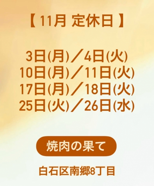 南郷にある焼肉の果て 11月定休日のお知らせ 2025-10-30 00:15:43 いつも「焼肉の果て」をご利用いただき、ありがとうございます😊札幌でも初雪が降り、いよいよ冬の訪れを感じる季節になりました❄️寒い日が続きますが、店内ではあたたかい空気と香ばしい焼き音が広がっています。やさしい煙と香りに包まれながら、心も体もぽかぽかにお過ごしください✨今月も、皆さまの「おいしい笑顔」にお会いできるのをスタッフ一同楽しみにしております😊